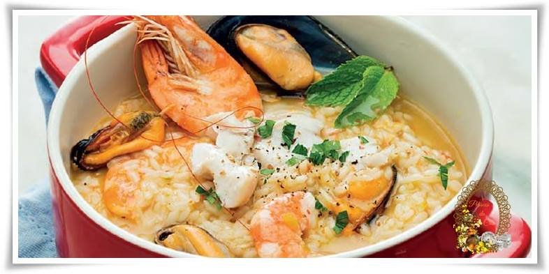 5. Adicione o sal q.b e junte o caldo de arroz com o creme de marisco