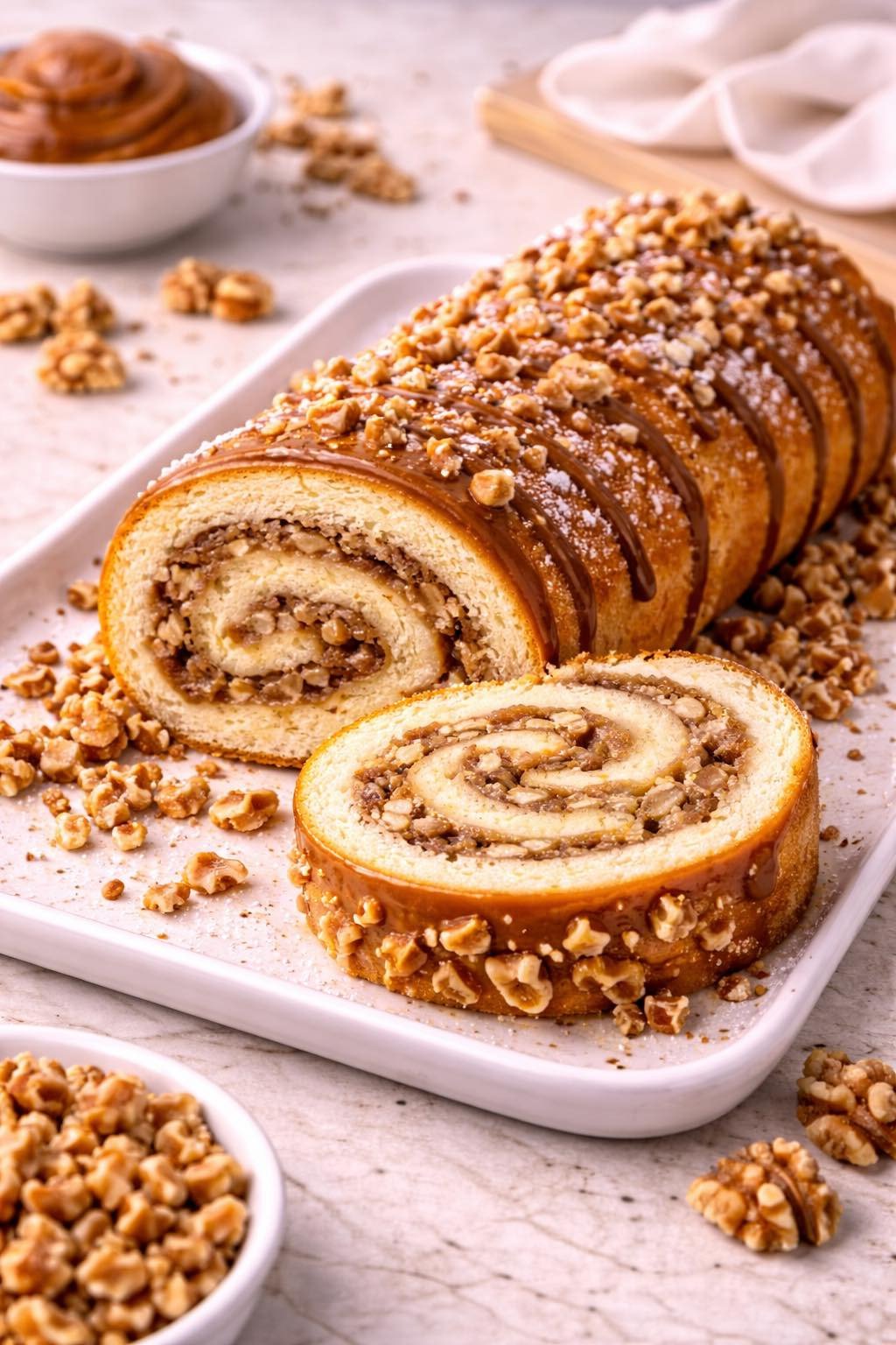 5. Retire do forno, desenforme enquanto ainda está morno, recheie com o doce de leite e as nozes e enrole com cuidado.
